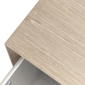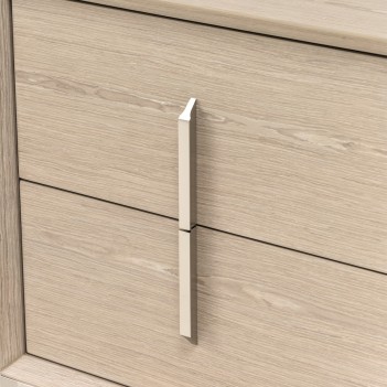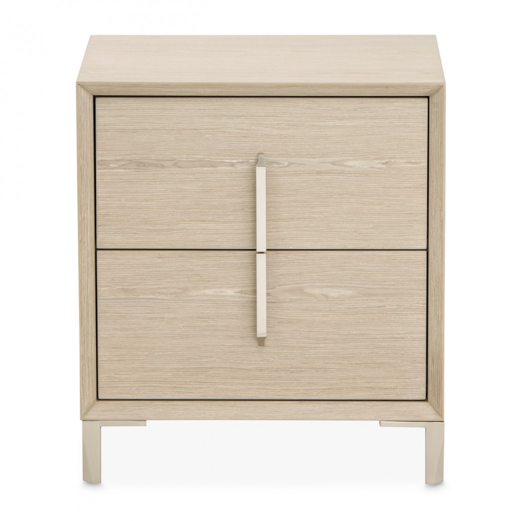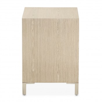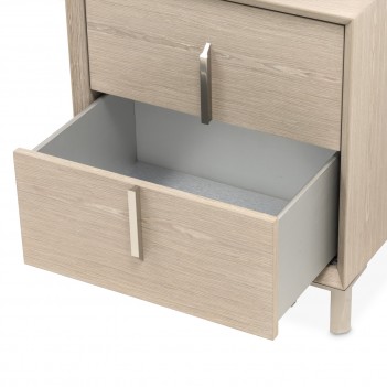 The Lotus Bay Small Nightstand brings the same quiet elegance as its larger counterpart, refined into a slimmer silhouette perfect for versatile spaces. Wrapped in a serene sand finish with the graceful character of white oak, its design is accented by elongated brushed steel hardware that gleams like jewelry against its sleek façade. Two soft-close drawers, reinforced with durable aluminum laminate bottoms, provide graceful storage with enduring strength, while the narrower surface offers the perfect stage for a luminous lamp or carefully chosen décor. A compact treasure, it brings both function and artistry to the bedside.