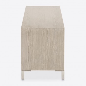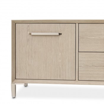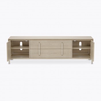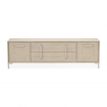 Designed with clean lines and a serene sand finish, the Lotus Bay Media Cabinet exudes quiet sophistication while offering the practicality today’s lifestyle demands. Brushed metal hardware gleams against the natural wood-inspired tones, creating a subtle interplay of textures that elevate any living space. Inside, thoughtful design ensures that beauty never compromises function. Wide soft-close drawers glide open with ease, their reinforced aluminum bottoms crafted for durability and elegance. Adjustable shelving behind the side cabinets offers tailored versatility, allowing you to curate storage for everything from electronics and media to fine entertaining pieces. More than just a place for your television, it becomes a refined centerpiece that anchors your room with style and purpose.