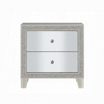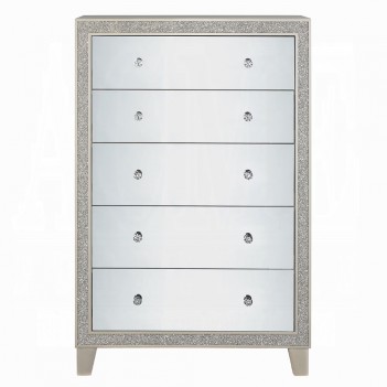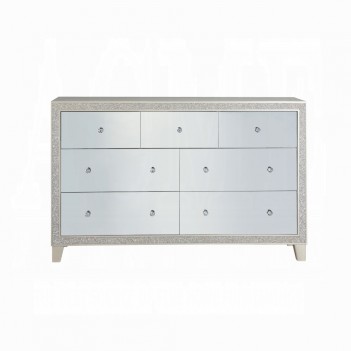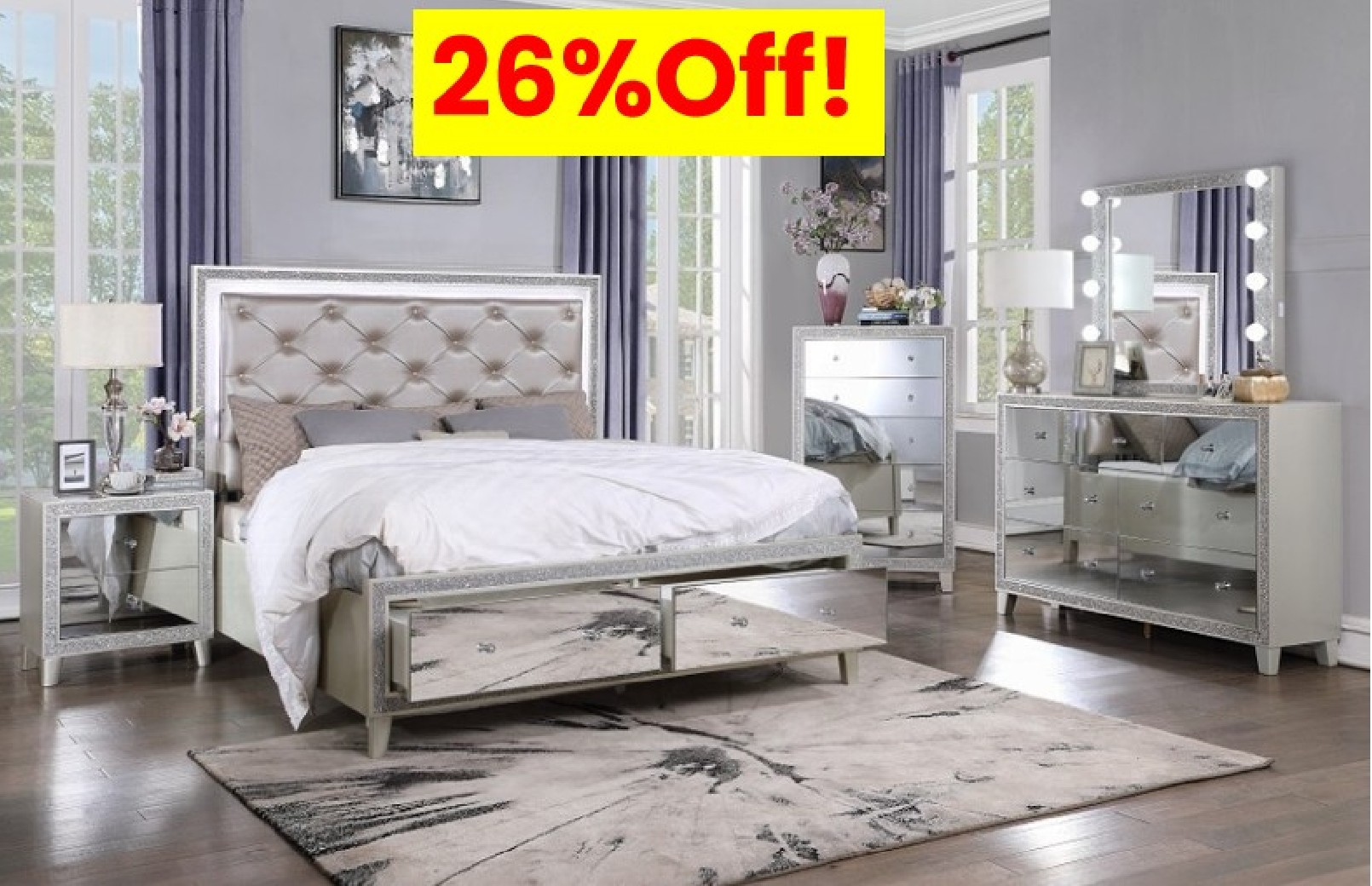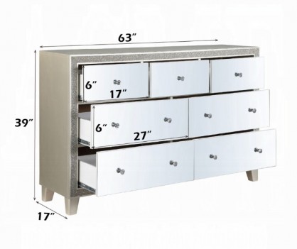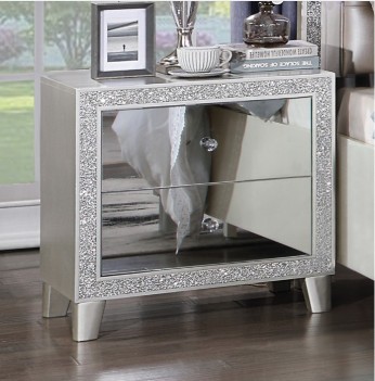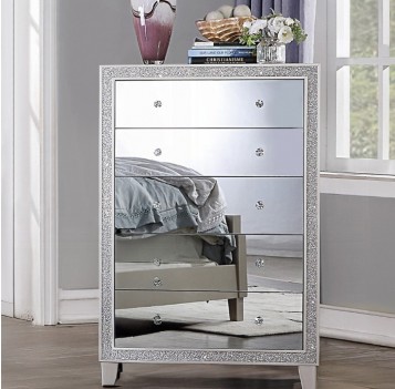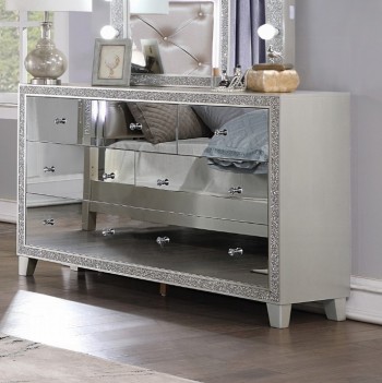 This modern glam bedroom collection uses mirrored furniture, metallics, and muted color tones to brighten up your place. The collection is adorned with eye-catching decorative accents like button-tufted headboard, raised molding trim, and LED lighting. Matching casegoods feature self-close drawer glide and felt lined top drawer for safety and function. The mirrored finish applied on each piece creates a shiny and lustrous surface, gently reflecting light that passes through the room. The Sliverfluff Bedroom Collection will bathe your room decor in glamorous luster and elegant glow.