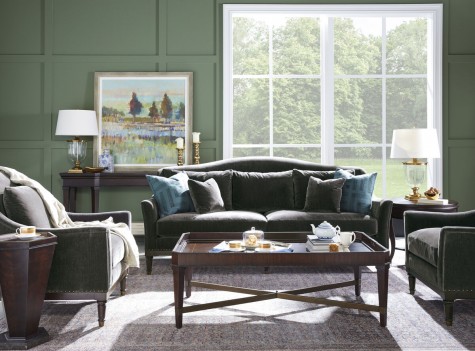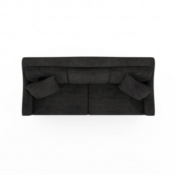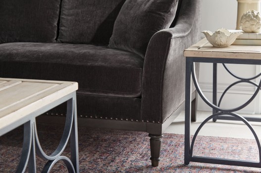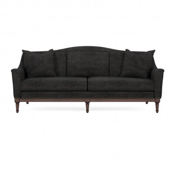 A classic camel back style sofa, Magritte offers timeless seating at a value. Featuring a 3 over 2 cushion configuration, this generously sized sofa offers a stylish lounging space without sacrificing comfort. Accented with a deep brown wood base, fully turned front gets and antique brass nailhead trim, Magritte has all the makings of an updated traditional aesthetic. Its velvet charcoal upholstery grounds your living space, while two included toss pillows offer extra comfort when desired.