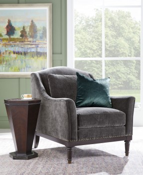 The Magritte Lounge Chair is a classic in the making. Featuring a deep brown wood base, fully turned front legs, and antique brass nailhead trim, this charming chair is versatile and timeless. Its camel back silhouette is upholstered in a rich, velvety fabric that features a lustrous sheen, adding an air of understated elegance to your space. Perfect on its own or in pairs, this chair is sure to become your favorite seat in the house!