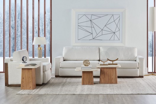 Designed to look stylish when paired or apart, this duo is sure to be the centerpiece of any sitting area. Angular wooden columns support luxurious stone tops, a perfect blend of the natural world and contemporary style. The bunching tables can be combined with the Portico Accent Table to form a matching trio of varying sizes.