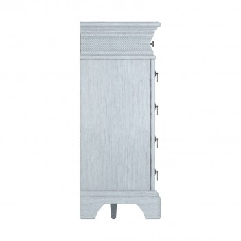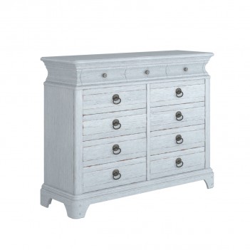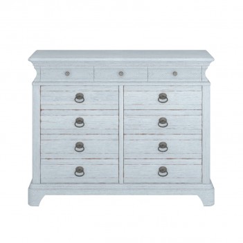The natural beauty of cathedral-sawn flaky oak takes center stage in the exquisitely crafted eleven-drawer Light Keeper's Dresser. From top to bottom the dresser is rich with artisanal details: cove molding around the top and base; a concave upper box banded with chevron carving; and wooden pegs on the bracket feet. The lightly distressed painted finish serves to warm the items with aged patina.