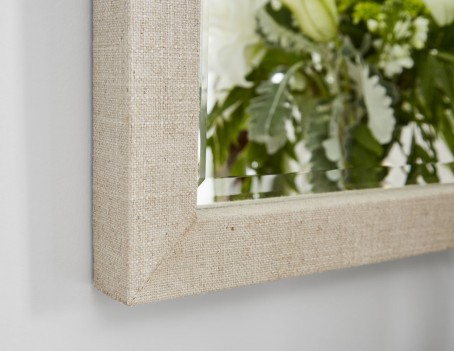 - Wood frame is wrapped in a linen-blend fabric that features a performance treatment