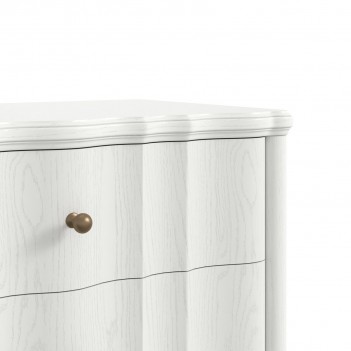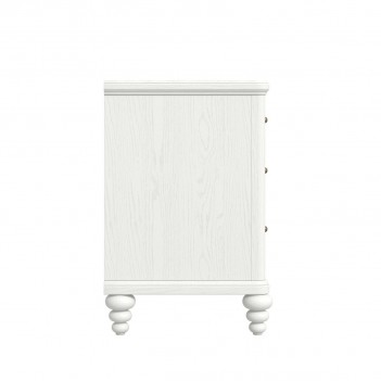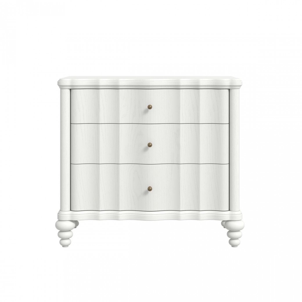 Add a touch of refined whimsy to your bedside with the Haven Nightstand that reimagines classic bedside storage with delightful details inspired by vintage finds. The gently fluted drawer fronts create a sense of textural interest, reminiscent of hand-carved details found in antique furniture. The soft, white finish adds a fresh, airy feel, while the delicate scalloped apron and turned feet echo the timeless charm of a countryside cottage. With its three drawers providing ample storage, this nightstand seamlessly blends functionality with the lighthearted elegance that defines the Haven collection. Perfect for keeping essentials close at hand while adding a touch of enchanting style to your bedroom.