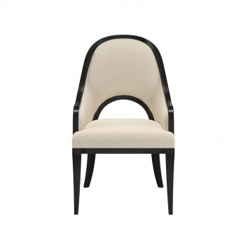 Exposed wood arm chair in blackened sable finish and contrasting beige fabric is as stately as it is comfortable, the hoop is repeated in an open arched space in the back for added elegance.