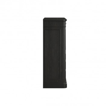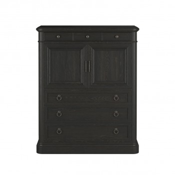 Storage options abound in this chest from the Atrium collection, combining six drawers with one tray drawer, and a lower drawer lined in aromatic cedar. The center storage area contains two adjustable shelves as well as a stacked set of drawers. Measuring 57-in tall, this combination chest is a striking addition to the bedroom setting. The rich grain detail and blackened sable finish is complemented by the delicate patina of rubbed bronze hardware