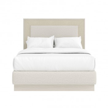 Form complements function beautifully in this modern panel bed, showcasing a solid base frame in a warm neutral finish highlighted by woven fabric wrap and an inset cream upholstered headboard. Reminiscent of strikingly geometric mid century architecture, the headboard and frame present vintage-inspired style with modern appeal.