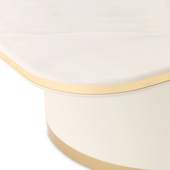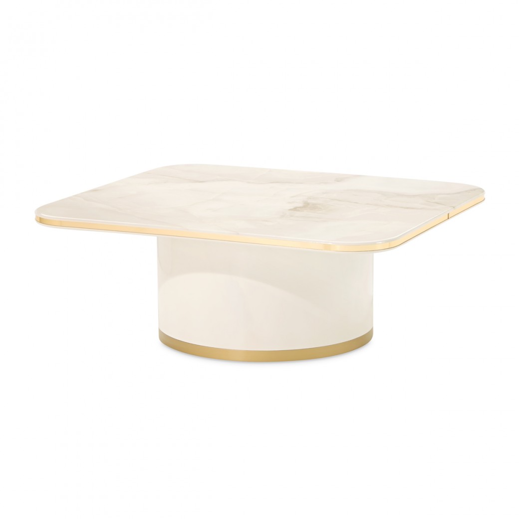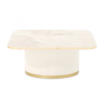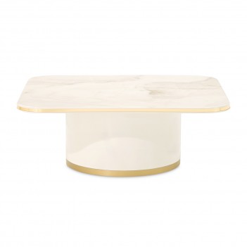 A luminous statement at the heart of the room, the Gineverra Rectangular Cocktail Table captures modern glamour through sleek form and radiant finishes. Its glossy ivory surface glows with a polished elegance, while the tabletop reveals a marble-inspired pattern that evokes the beauty of natural stone with soft, flowing movement. A gleaming gold trim frames the silhouette like a touch of fine jewelry, completing the design with refined brilliance.