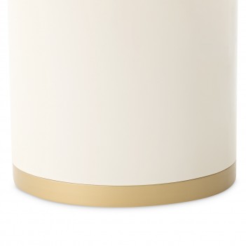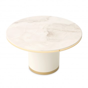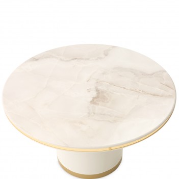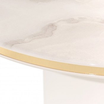 Graceful and luminous, the Gineverra Round Cocktail Table captures the essence of modern glamour with its sculptural simplicity and radiant finishes. The glossy ivory surface glows with a polished elegance, while the tabletop reveals a marble-inspired pattern with soft, flowing veining that evokes the beauty of natural stone. Encircled by a gleaming gold trim and supported by a sleek pedestal base, the design feels effortlessly refined—an elegant centerpiece that brings quiet drama and sophistication to the room.