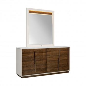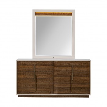 Sculptural balance and modern elegance define the Pavira Dresser & Mirror Set, where refined finishes meet intentional design. A serene taupe framework is layered with high-gloss, eucalyptus-inspired walnut fronts that catch the light and create depth through subtle curvature. Above, the mirror adds a luminous architectural moment, framed with clean lines and softly integrated illumination. Together, the pairing delivers a composed, gallery-worthy statement that elevates both form and function.