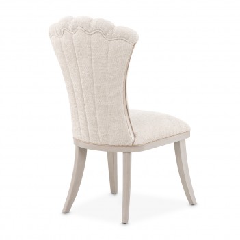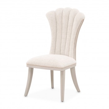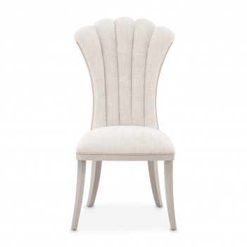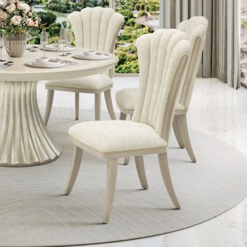 Gracefully contoured and richly detailed, the Fantosini Side Chair is a celebration of timeless glamour. Its fan-shaped silhouette evokes the elegance of haute couture design, while sumptuous chenille in a cappuccino hue envelopes the frame in soft sophistication. Sculpted wood insets and radiant gold welting accentuate every curve, capturing the light and elevating the ambiance of your dining space.