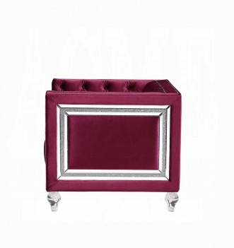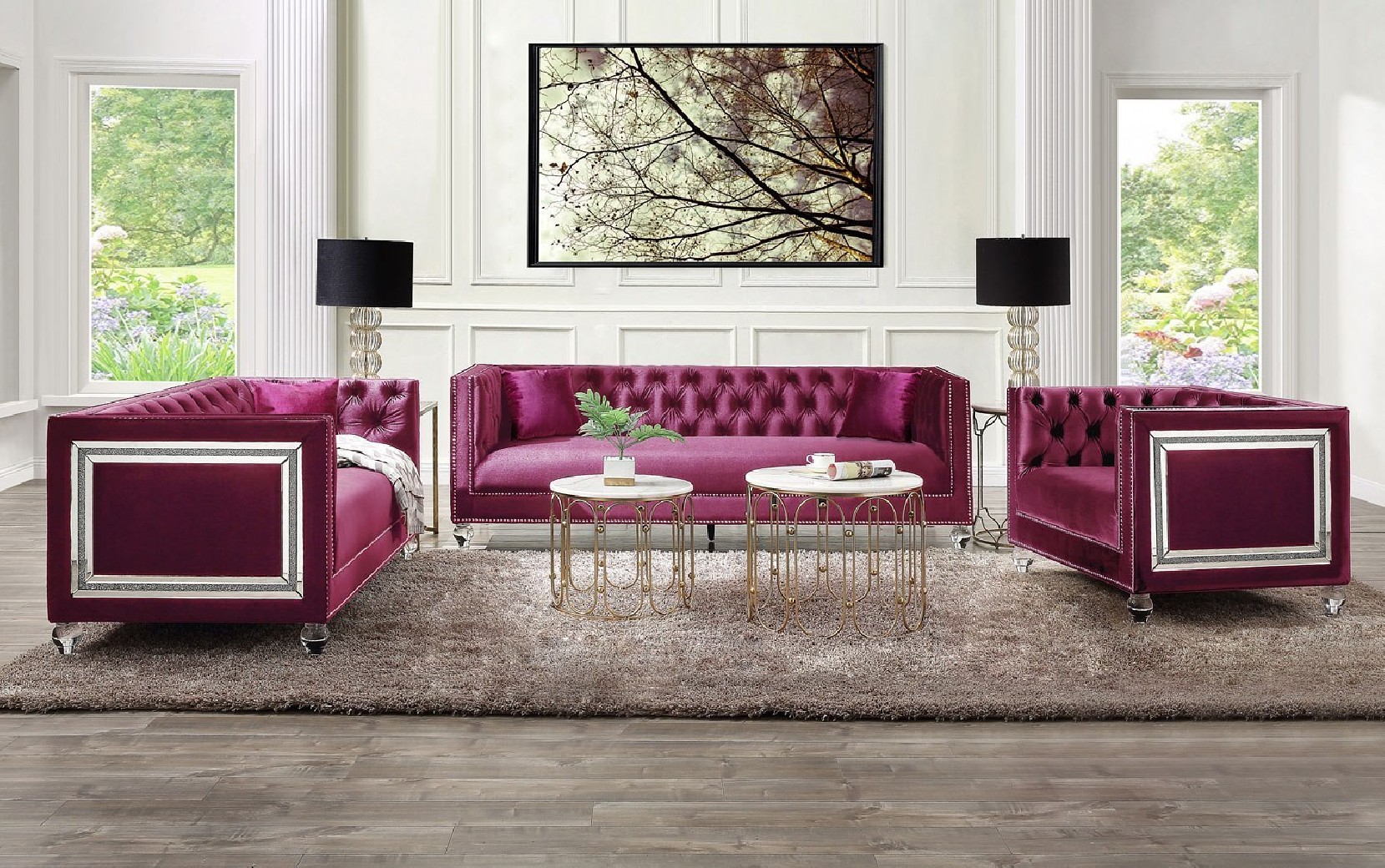 Looking to create a glamorous living room, look no further. The Heibero collection is ideal for that. Featuring timeless button tufting and the more modernized fine details such as the mirrored trim accents. The burgundy velvet upholstery is an eye-catcher. Have the best of both worlds contemporary and classic all in one with this collection. Solidly constructed, this sofa rests securely on four acrylic legs. This collection is a perfect solution for providing seating for you and all your guests.