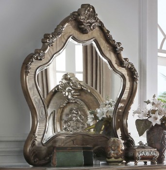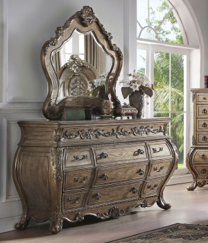 The Ragenardus bedroom collection is an impeccable example of truly memorable with its luxurious traditional design. Your bedroom will be dignified with the center piece. This arched panel bed has a beautiful designed head- board with intricate floral designs around the border. The footboard is perfectly match with button tufting and floral carvings details. The dresser, chest, and nightstand feature a matching detailed French style front. Every piece of the bedroom creates a vintage style from the hand carved designs to the button-tufted upholstery.